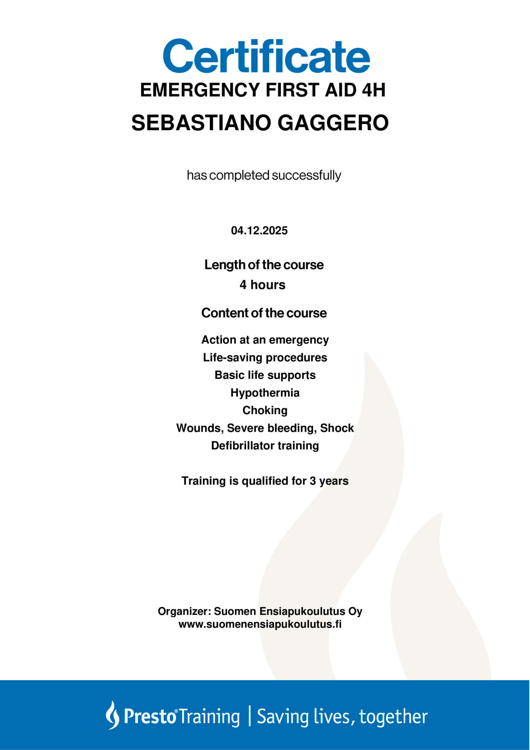 Emergency First Aid Certificate by Suomen Ensiapukoulutus Oy.
